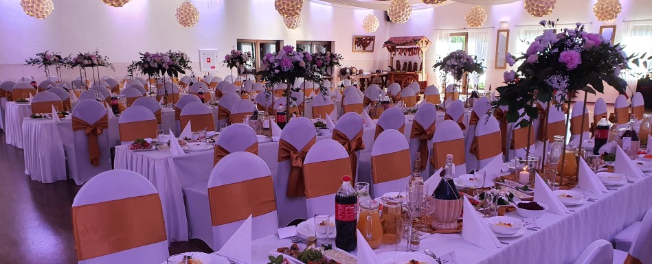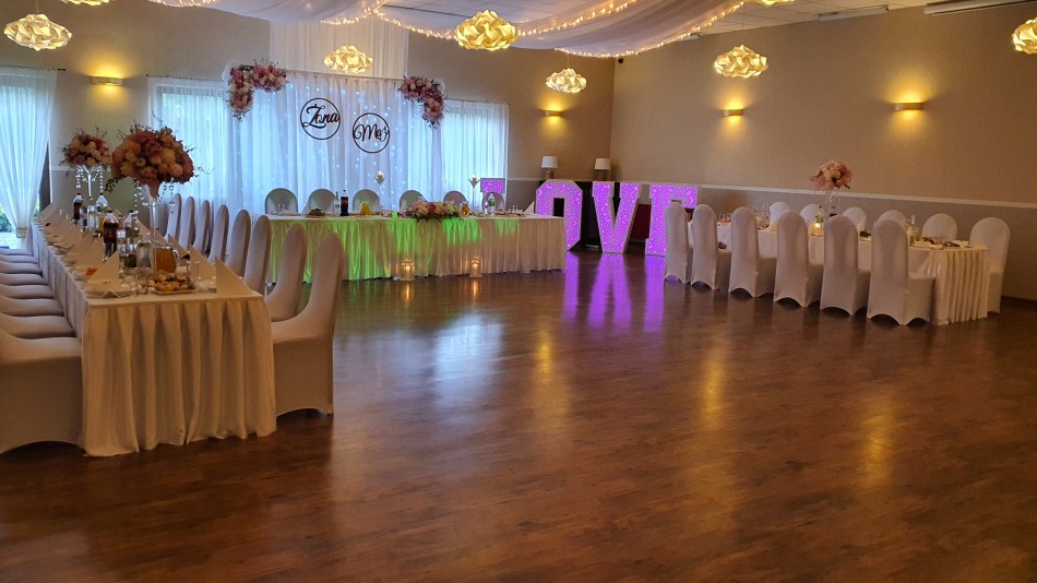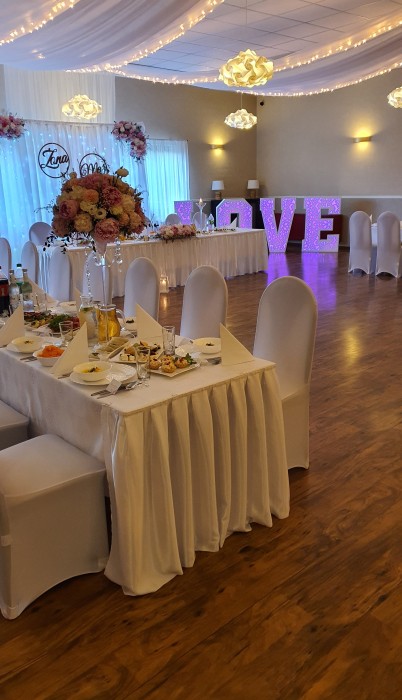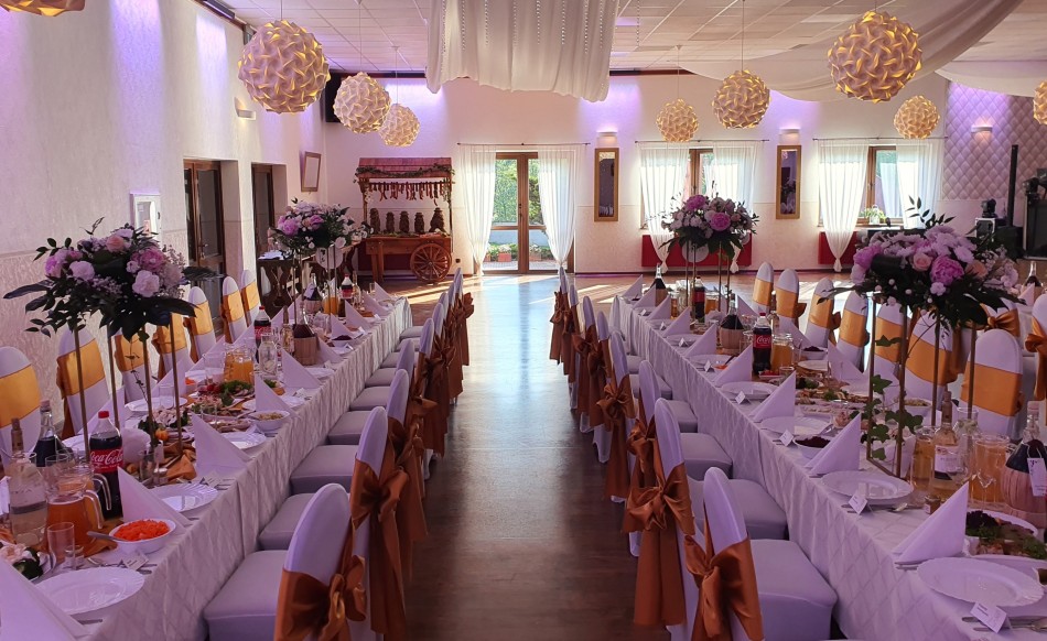 Posiadamy dwie sale, a dzięki możliwości ich połączenia jesteśmy przygotowani do realizacji przyjęć od najmniejszych rozmiarów poprzez kilkudziesięcioosobowe przyjęcia, aż do 380-osobowych realizacji.